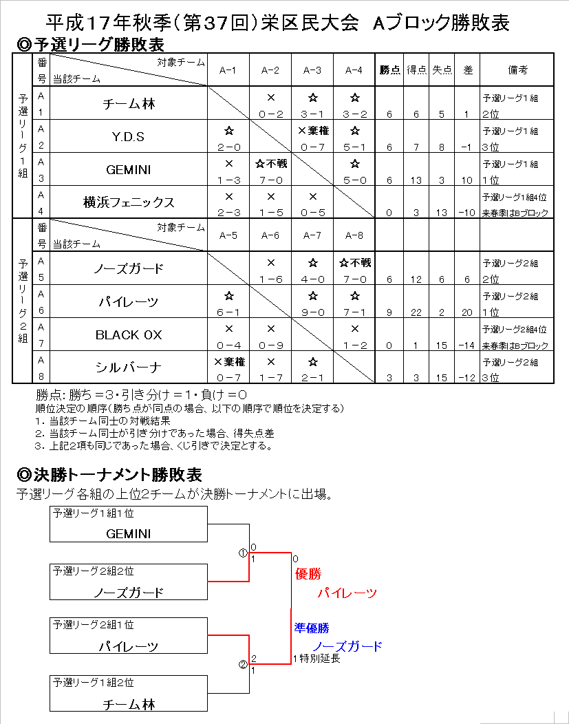 平成17年度秋季栄区民大会 Aブロック勝敗表